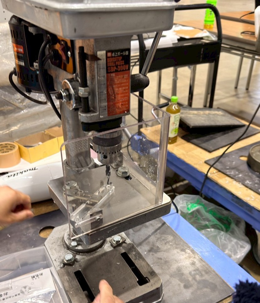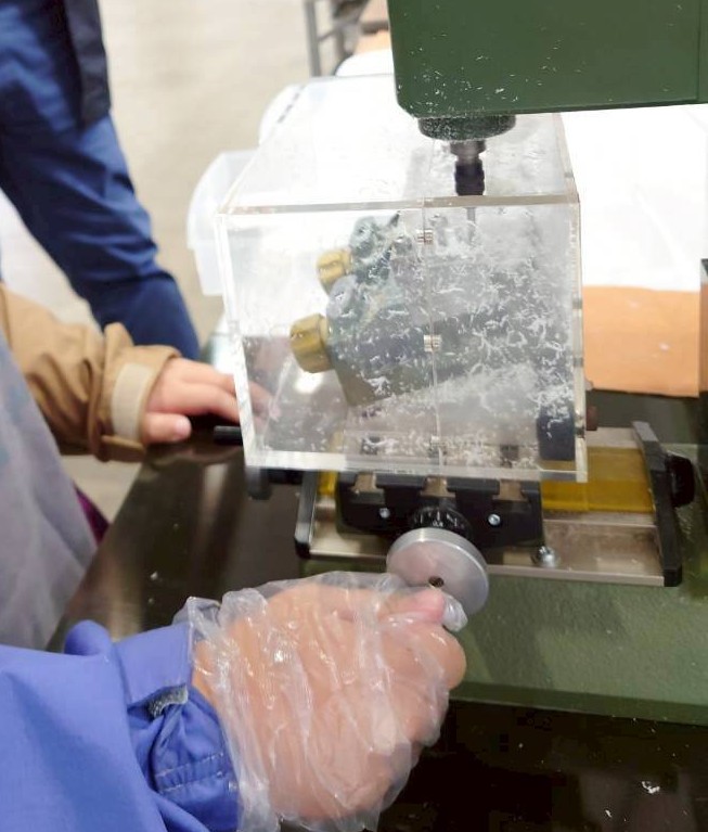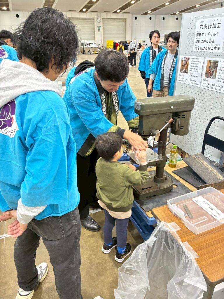 次に、ネジの頭が入る穴を「ボール盤」で開けていきます。これもまた、実際の製造現場で使われる機械。青年会員が一つひとつ丁寧に説明し、子どもたちは少し緊張しながらも、見事な操作で穴開けを体験してくれました。