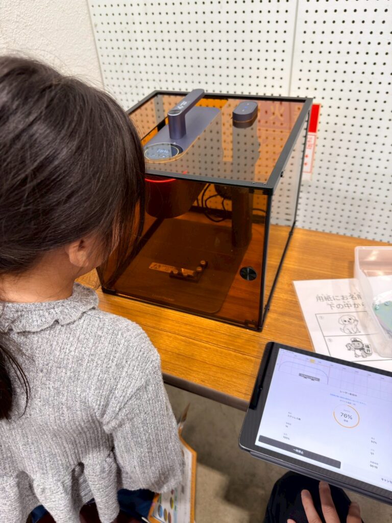 レーザーが刻印されていく様子を、子どもたちは目を輝かせながら、驚きと興奮いっぱいに楽しんでいました。