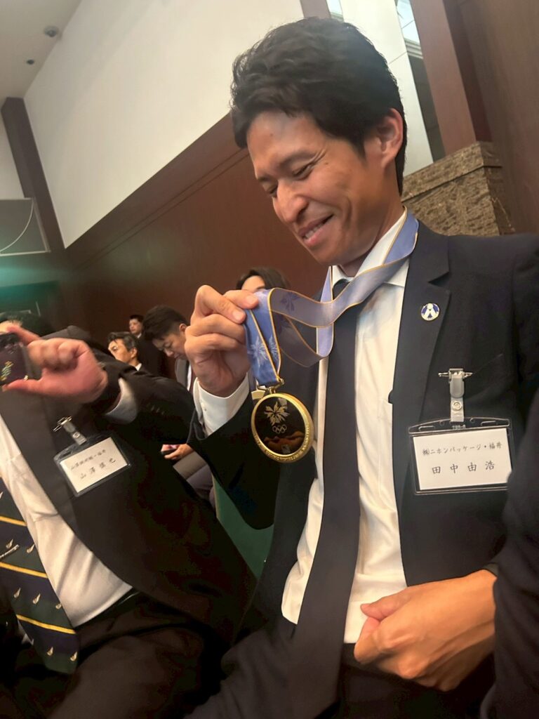 ずっしり重い金メダルを・・・ちゃっかり肩に掛けニヤけるT氏。