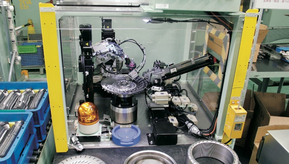 アイシン福井では工法の開発から、各種生産設備・装置の設計・製作、ライン構築に至るまで、生産技術の徹底的な「自前化」を推し進めています。これらの技術を活かすことで電動化製品向け生産設備にも着手。作業者の安全とユーザビリティに配慮、製品を “つくりやすい” 設備やライン開発で作業性の向上と生産コスト低減も同時に実現しています。