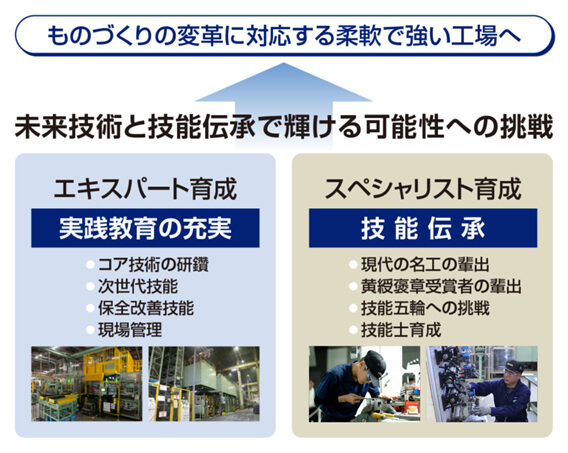 私たちは、ものづくりの変革に対応できる柔軟な人材を育成するため、エキスパートとスペシャリストの育成に力を注いでいます。未来技術の習得と技能の継承を通じて、社員一人ひとりが新たな可能性に挑戦し続けられる環境を整えています。