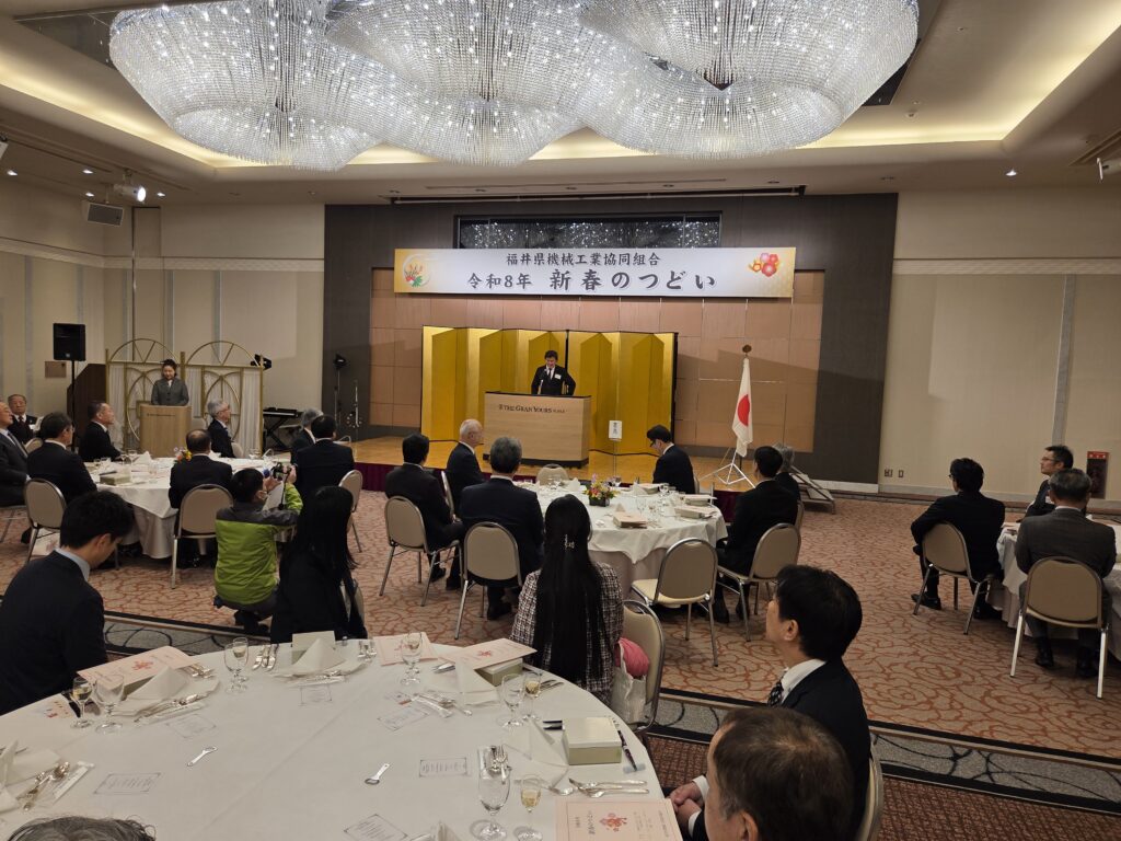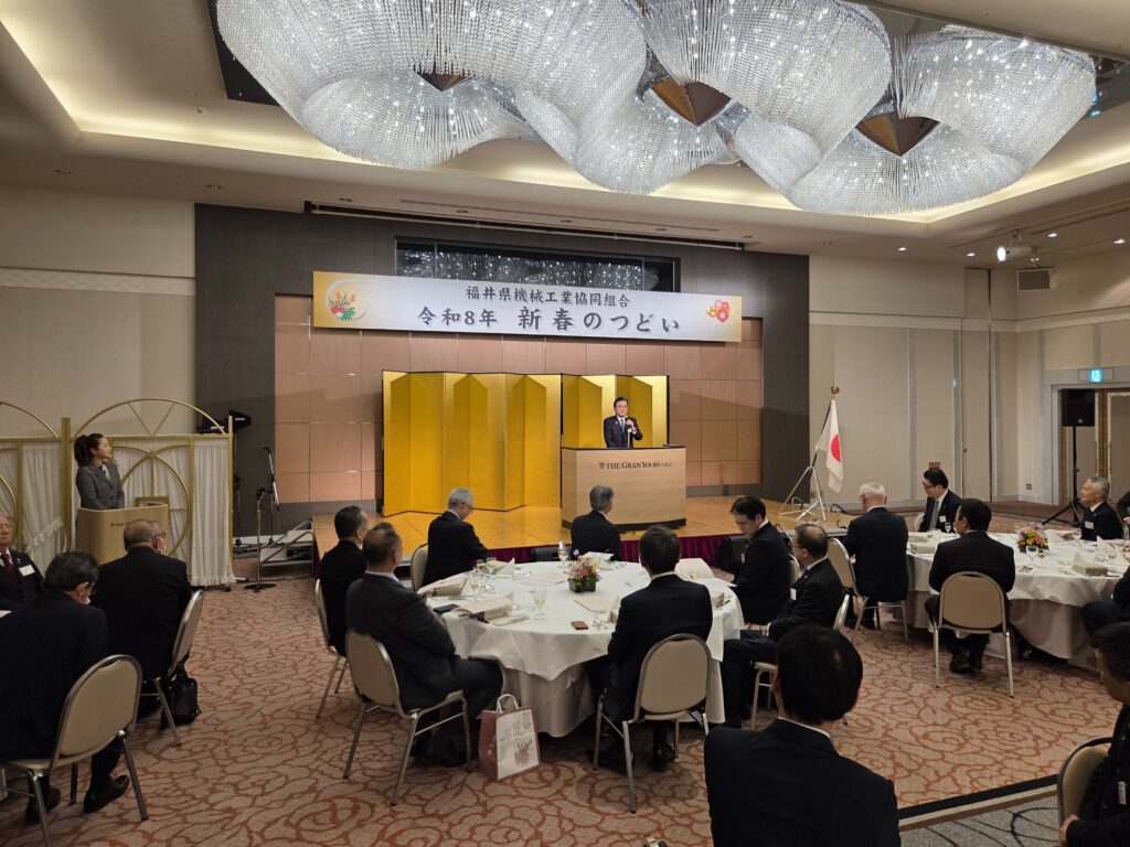 令和8年1月14日(金)午後6時から、「新春のつどい」が福井市のザ・グランユアーズフクイで開催されました。年頭挨拶で中山理事長は「組合は未来を担う技術の集団。経済情勢が激変する中、恐れずに技術で挑戦していきたい」と新年の抱負を語りました。来賓の西行福井市長からは「福井の元気は企業の皆さんが元気でなければ実現しない。組合の繁栄をお祈り申し上げる」と当組合への期待を込めた祝辞が述べられました。乾杯の後、福井、石川を拠点に活躍しているシンガーソングライター「クミーシャ」さんの歌と浜町芸妓お二人の祝舞も披露されるなど、華やかな雰囲気の中、90人の参加者が新年の挨拶を交わし、業界の発展を誓いました。