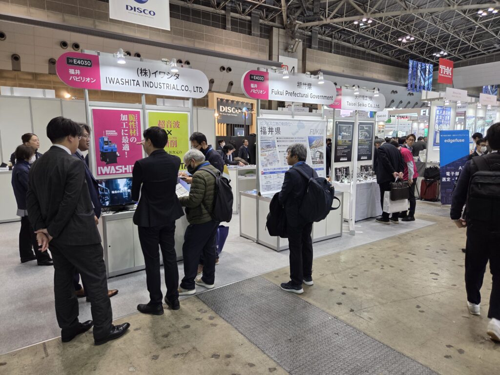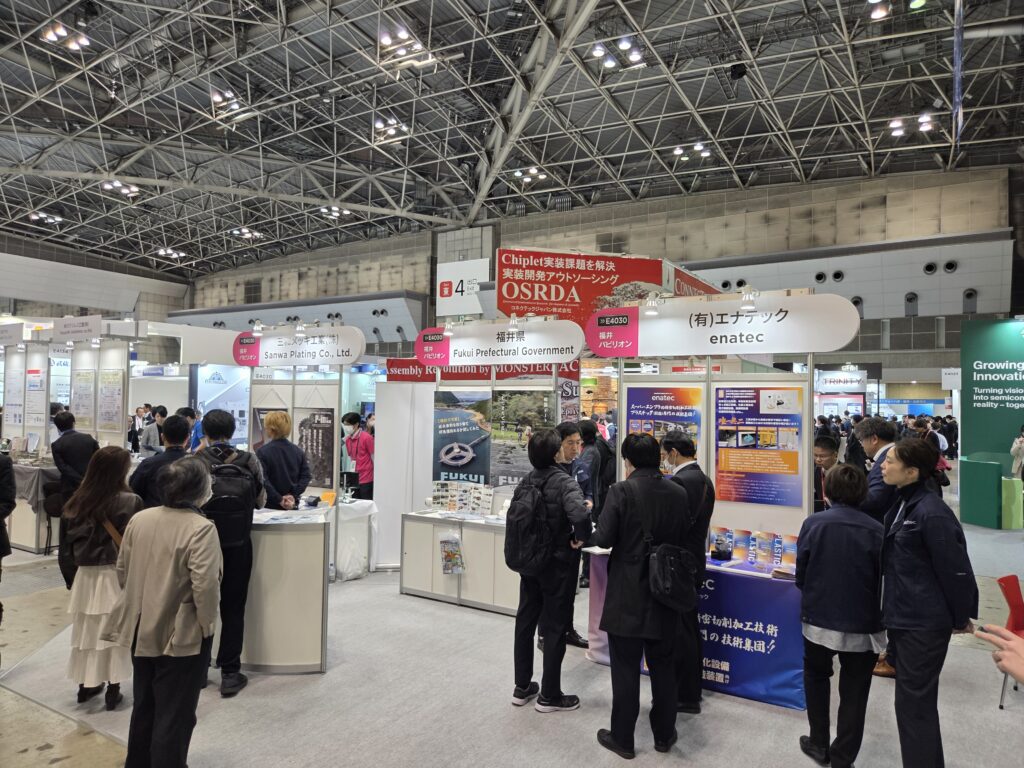 SEMICON JAPANは半導体産業における製造技術、装置、材料など、エレクトロニクス製造サプライチェーンの国際展示会です。令和7年12月17日(水)から19日(金)まで、東京ビッグサイトで開催された同展示会の福井パビリオンに、当組合から、㈱イワシタ、大成精工㈱、(有)エナテック、三和メッキ工業㈱の4社が出展し、各ブースで自社の製品・技術を来場者にPRしました。今回、半導体製造工程の全域にわたる1,200社・団体の出展があり、延べ来場者は12万人を超えました。