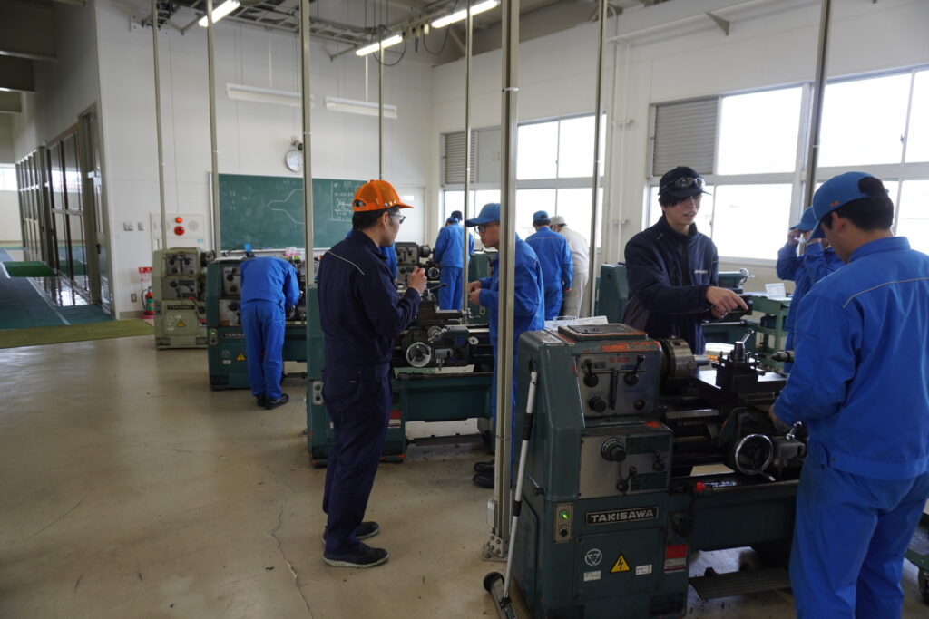 2026.03.06 お知らせ 熟練技術者が高校生に技を伝授 当組合では、卓越した技能・技術の実演や実地指導を通して、ものづくりの楽しさや技術の素晴らしさを知ってもらい、業界の後継者育成に繋げようと、組合員企業の熟練技術者を県下の工業系高校に派遣しています。令和8年2月20日、㈱日本エー・エム・シーの社員2名が奥越明成高校を訪れ、機械科2年生17人の皆さんに、汎用旋盤を用いての旋盤加工のやり方・コツなどを伝授しました。